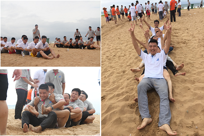 通過前面三個緊張的比賽之后,決出了四個隊伍進行終極項目—沙灘足球比賽。比賽中我們全體成員手拉手圍出了一個足球場,大家既是邊界,又是觀眾,參與感非常強。每一次斷球,都有搶奪競爭對手客戶時的喜悅;每一次傳球,都是團隊隊員相互之間的信任;每一次帶球奔馳,都像手握項目漏斗有底氣;最后的臨門一腳,像揮灑汗水拿到了訂單,充滿了愉悅。看著大家在金沙上努力拼搏的樣子,我們激情高漲,抬頭看了看海的遠方,心中充滿了愛與喜悅。